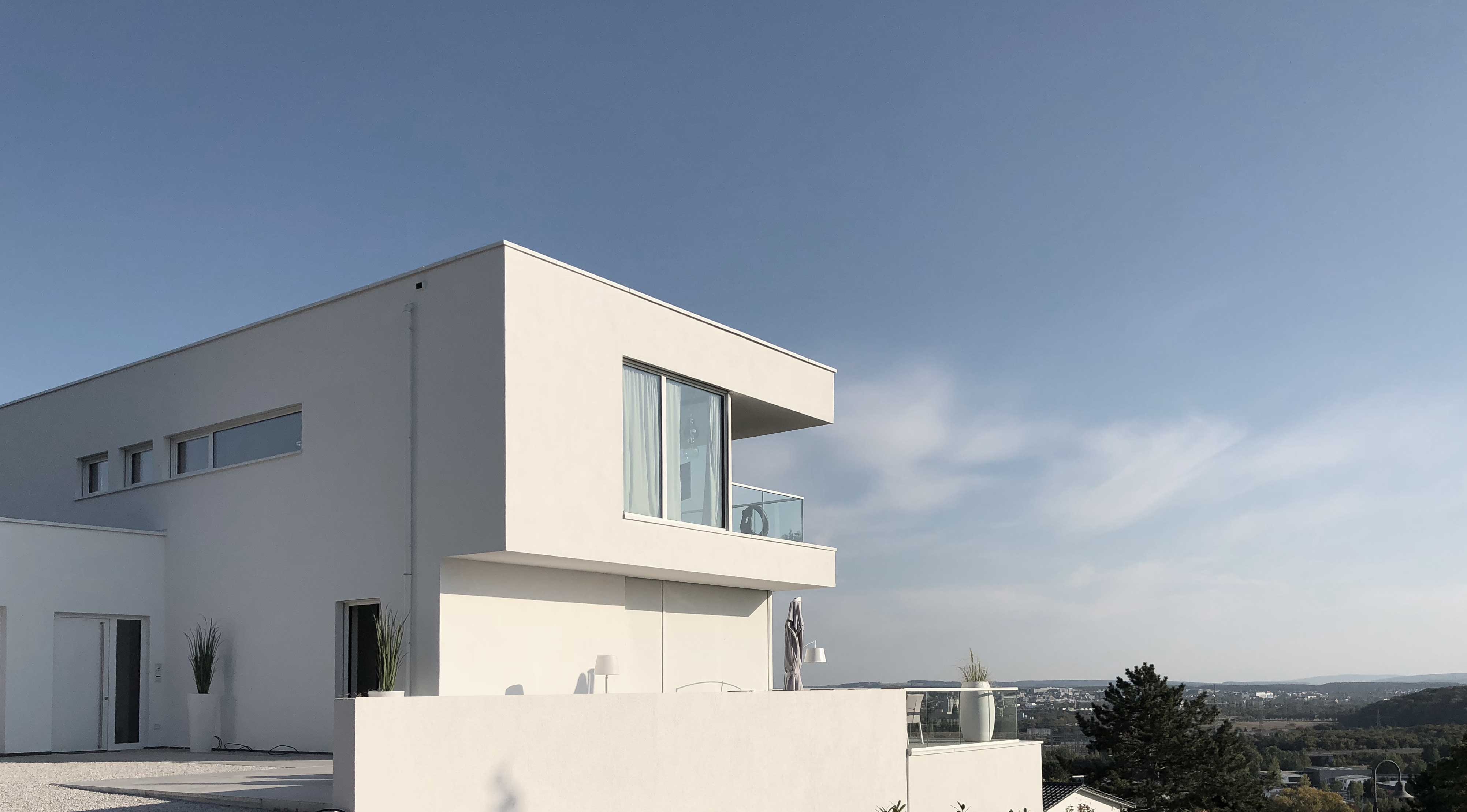 Das am Hang gelegene Wohnhaus öffnet sich in drei Richtungen nahezu komplett und bietet ein beeindruckendes 180° Panorama auf Gießen und das Gleiberger Land. Weiße Screens sorgen nicht nur für Verschattung und all zu neugierige Blicke, sie lassen das Gebäude im geschlossenen Zustand wie einen Monolith wirken.