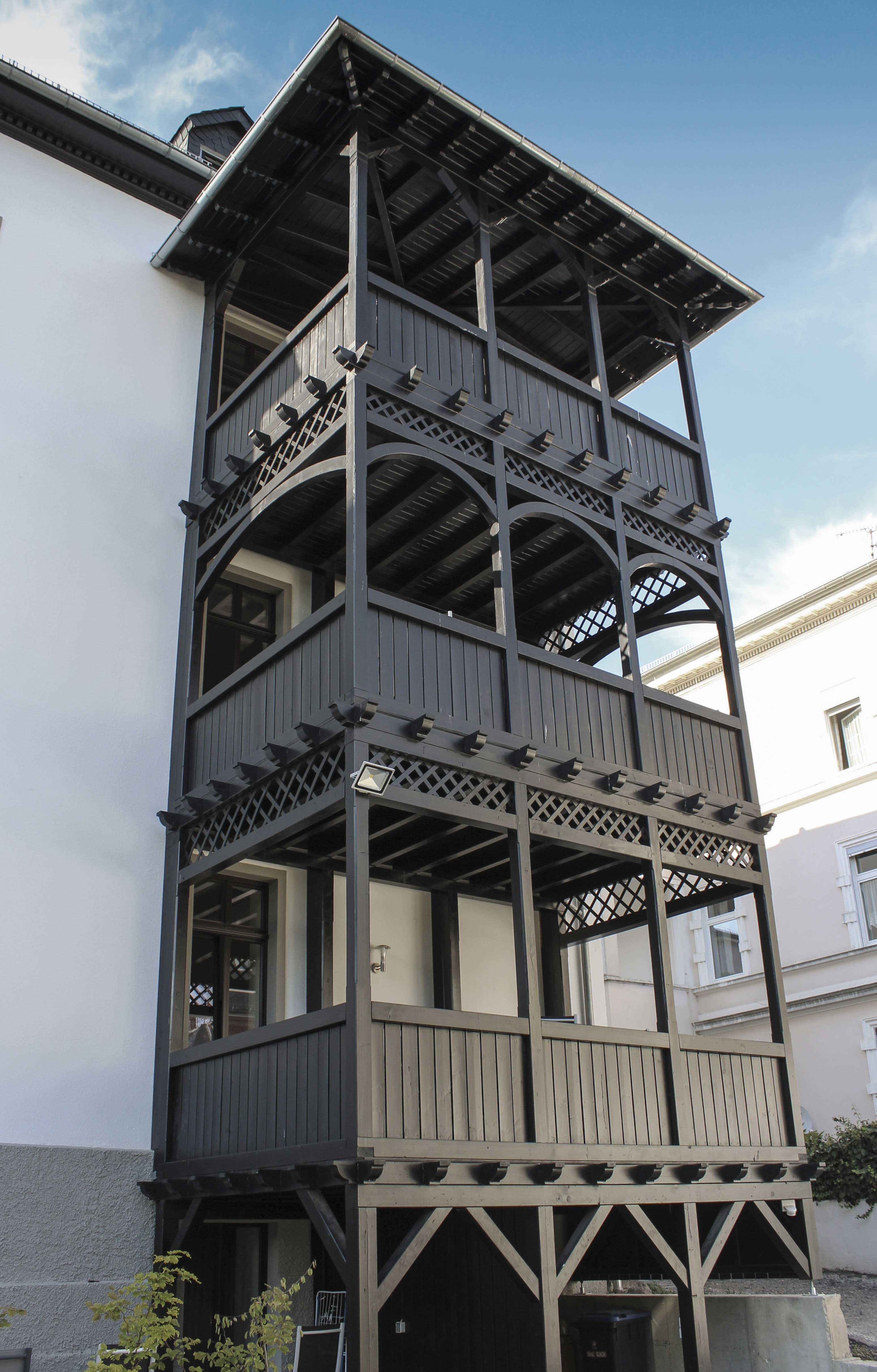 Das Wohnhaus von 1886 mit Mittelrisalit auf quadratischem Grundriss wurde in den 1960er Jahren mit der Entfernung aller Gliederungs- und Schmuckelemente nahezu gesichtslos. Anhand umfassender Archivrecherche, alter Planunterlagen und Postkarten wurden Informationen über das ursprüngliche Fassadenbild zusammengetragen. In einer Technik mit wassergestrahlten Schablonen wurden die Fassadenelemente inklusive den Schatten aus den Zeichnungen aufgebracht, überputzt und danach wieder entfernt, so dass sich ein Relief der ursprünglichen Fassade abzeichnet.