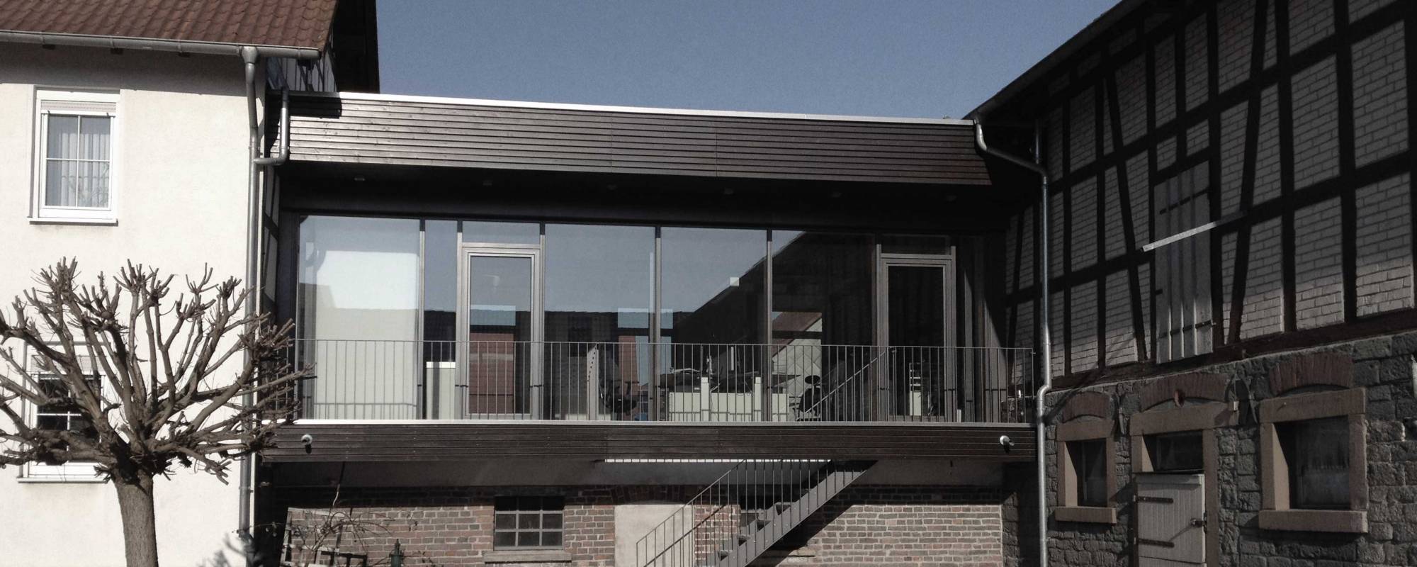 Die mitten im Ortskern von Romrod-Zell, in unmittelbarer Nähe zu Kirche und einem Ensemble aus Vogelsberger Einhäusern gelegene Hofreite erhält einen Erweiterungsbau. Die neu entstehenden Büroflächen legen sich als Flachdachbau über ein bestehendes Nebengebäude zwischen Wohnhaus und Scheune. Durch seine niedrigere Höhe, Dachform und die schlichten Formen, nimmt der Baukörper sich selbst zurück und fungiert mit seiner horizontal angeordneten Holzverschalung als Bindeglied der beiden Fachwerkbauten. Farblich nimmt die Holzfassade die dunklen Brauntöne der Fachwerkbalken wieder auf und schafft einen harmonischen Übergang.