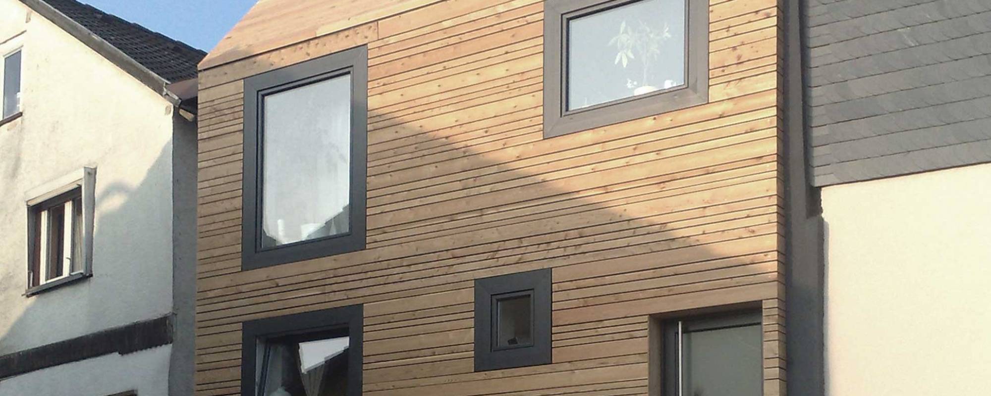 Der Umbau des kleinen Hauses beinhaltet die Schaffung von großzügigem Wohnraum auf einer kleinen Fläche im historischem Umfeld. Das Gebäude soll zeigen, was moderne Architektur in ländlichen Gegenden leisten kann und somit ein gutes Beispiel für modernes Wohnen auf dem Land darstellen. Die alte vorhandene Bausubstanz wurde sorgsam rückgebaut, Erhaltenswertes für die Bewohner konserviert. Der ausgebaute Lehm der Gefache fungiert als Putz, alte Eichebalken wurden z.B. als Fensterbänke oder Möbel wieder verwendet. Die Entfernung des vorhandenen PVC-Belags auf den alten Treppenanlagen gehörte genauso wie die Aufarbeitung der Holz- und Terrazzostufen zum Umfang der Umbaumaßnahme. Des Weiteren wurde ein besonderes Augenmerk auf die Gestaltung der Gebäudefassade gelegt. Die vorhandene Rauputzfassade wurde gedämmt und durch eine hinterlüftete flächenbündige unbehandelte Lärchenholzschalung ersetzt und stellt somit einen nachhaltigen Bezug zur Fachwerkbauweise der Umgebung her. Die Verwendung und Gestaltung der ursprünglichen Materialien wurde auf moderne Weise neu interpretiert. Um den zeitgemäßen Umgang mit der alten Gebäudesubstanz darzustellen wurden alle Fassadendetails deutlich reduziert und in Einklang mit der ländlichen Umgebung gebracht. Seine einfache Erscheinung wurde durch den nicht sichtbaren Übergang von Fassade und Dach fortgesetzt. Da das Grundstück komplett durch das Gebäude überbaut ist und somit keine privaten Außenbereiche vorhanden sind, wurde eine Dachterrasse mit Burgblick auf der Gebäuderückseite integriert.
