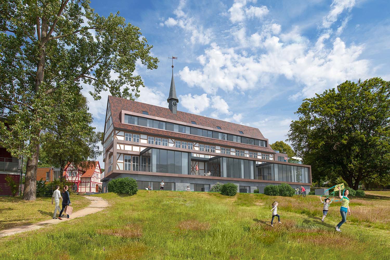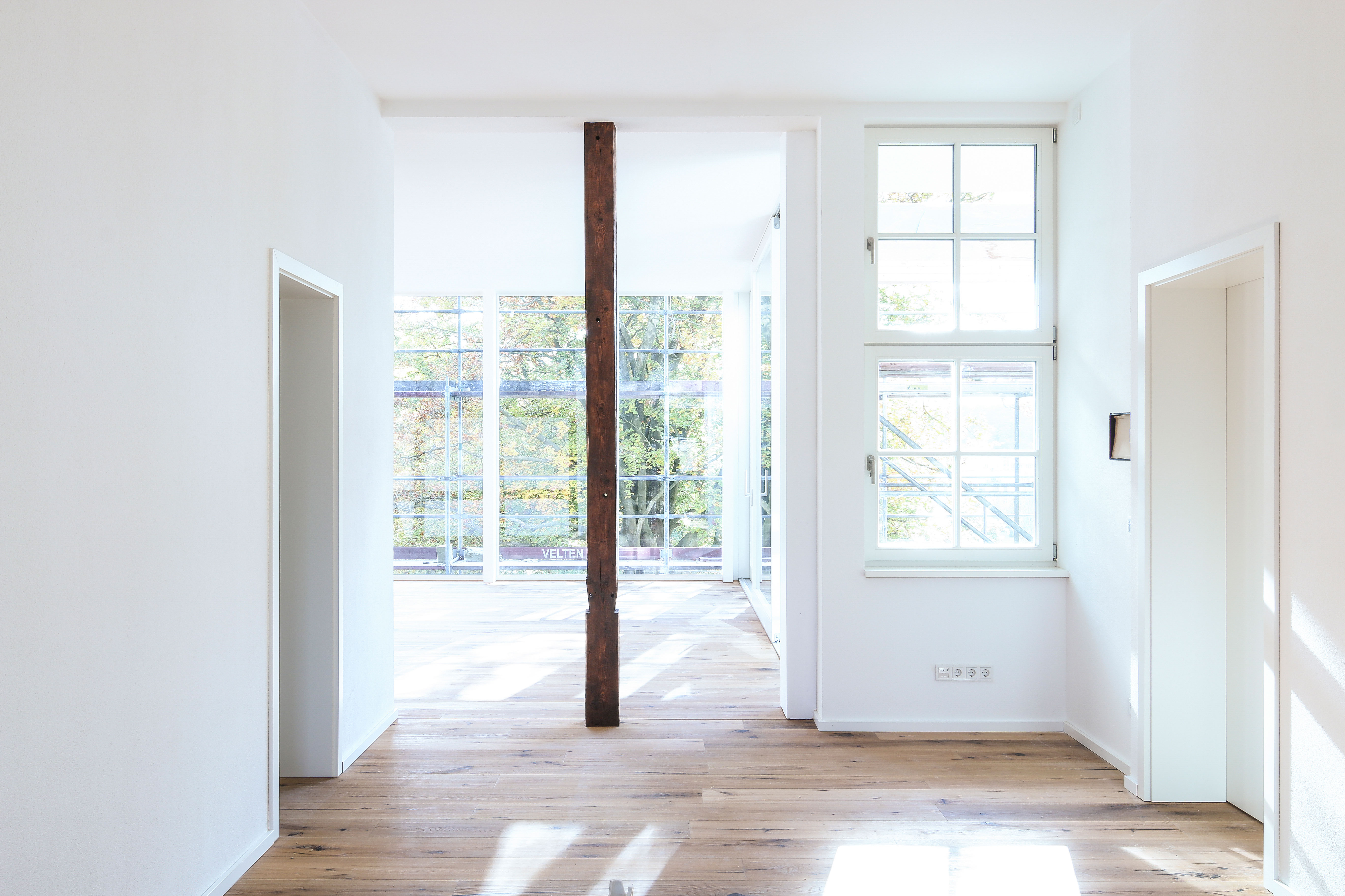 Ein neuer Riegel auf der Süd- und Ostseite umschließt das heutige Gebäude halbseitig und ermöglicht großzügige Terrassen und lichtdurchflutete Loggien. Die durchglaste und vorspringenden Bauweise vermittelt Transparenz und Leichtigkeit und akzentuiert die alte Fachwerkkonstruktion. Innenliegende Fahrstühle ermöglichen den bequemen Zugang zu Wohnung und Abstellraum. Gaubenbänder auf beiden Seiten des Dachgeschosses vervielfachen die Aussichten. Die Wohnungen orientieren sich zum einen entlang des bestehenden, äußerst repräsentativen Hauseingangsbereiches und zum anderen am deutlich vergrößerten und modern gestalteten östlichem Treppenhaus. Die Wohnung im Gartengeschoss der Westseite hat als einzige einen vollständig separaten Eingang. Die Anbauten sind in enger Abstimmung mit dem Denkmalschutz in Struktur und Materialverwendung modern gehalten und komplementieren einzigartig die Altsubstanz. Alle zehn Wohnungen sind hinsichtlich ihrer Lage, ihrer Aufteilung und ihres Charakters Unikate. Eine solche Vielfalt in einem Gebäude ist sonst kaum anzutreffen. Wohnungen mit Maisonettecharakter, Splittlevel, begehbares Glockentürmchen, Gewölbe, eigener Gartenanteil, offene Fachwerkkonstruktionen.