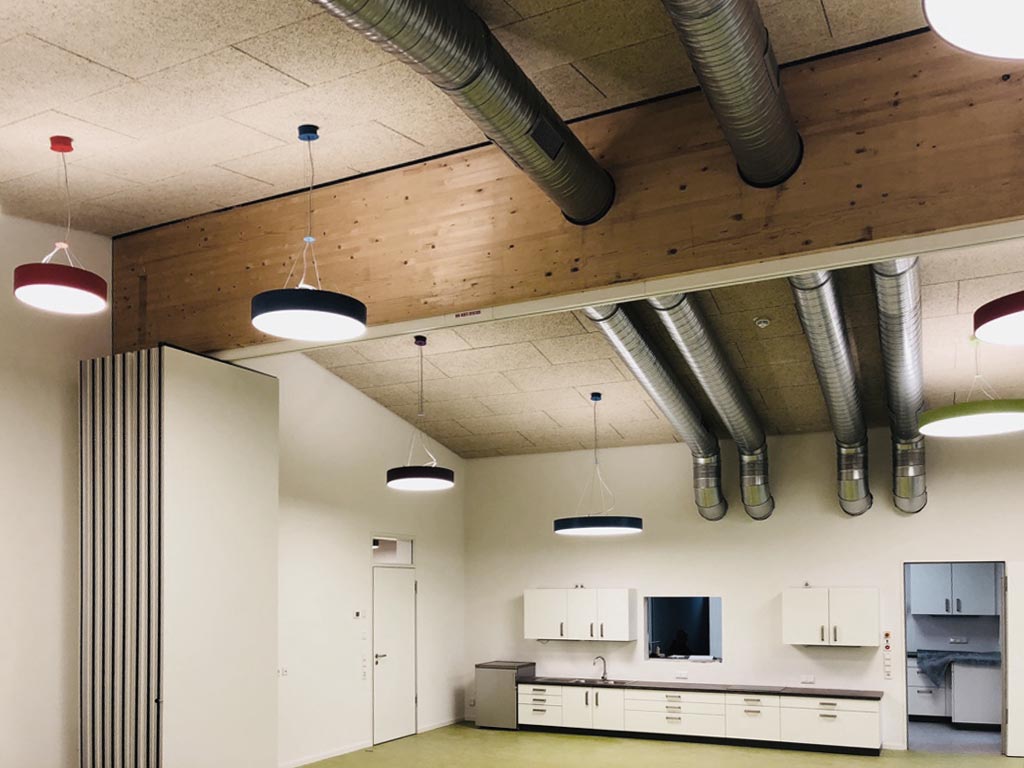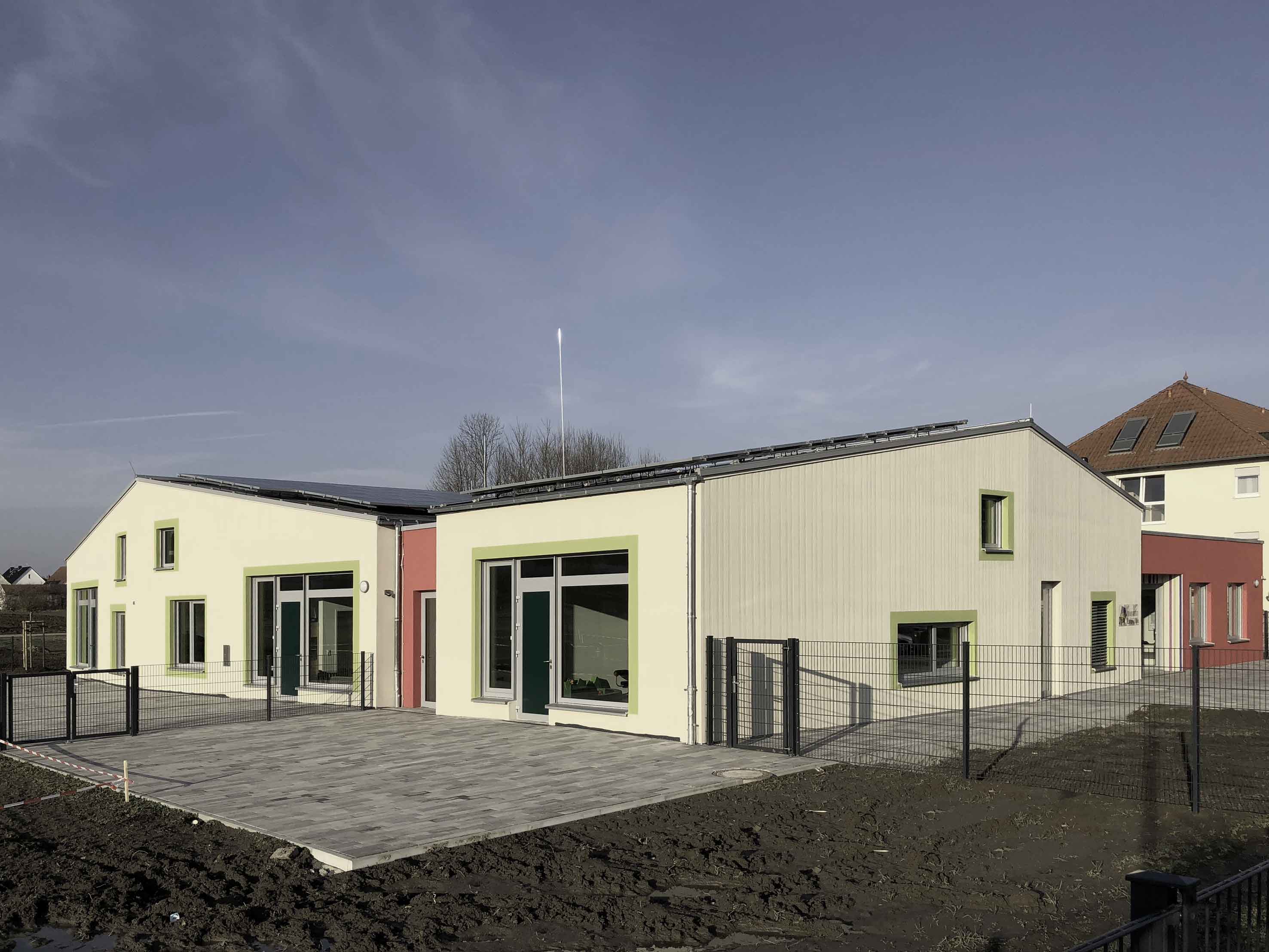 Der Kindergarten umfasst drei Gruppen. In der Regelgruppe werden 25 Kinder im Alter von drei bis sechs Jahren betreut. Werden Kinder mit Behinderung betreut, kann die Anzahl der Betreuungsplätze entsprechend reduziert werden. In der altersgemischten Gruppe werden ebenfalls 25 Kinder betreut. Hier ist allerdings schon eine Betreuung ab dem zweiten Lebensjahr möglich. Die ´ Nestgruppe bietet Platz für 12 Kinder im Alter von zwei bis drei Jahren. Damit trägt der Bauherr der großen Nachfrage in diesem Bereich Rechnung und erhöht das Platzangebot für Kleinkinder deutlich. Insgesamt finden bis zu 62 Kinder einen Betreuungsplatz. Direkt aus den drei Gruppenräumen gelangt man in die beiden Schlafräume, in denen Kinder mit Ganztagsbetreuung schlafen können. Der Mehrzweckraum wird durch eine mobile Trennwand vom Speiseraum getrennt, an den die Ausgabeküche angrenzt. Für Feste und gemeinsame Aktivitäten bietet sich hier ein optimaler Platz. Neben Personal-, Sanitär- und Reinigungsräumen findet man auch einen Differenzierungsraum, der eine intensivere Arbeit mit den Kindern ermöglicht. Durch einen kleinen Innenhof werden die Flurbereiche hell und offen wirken.