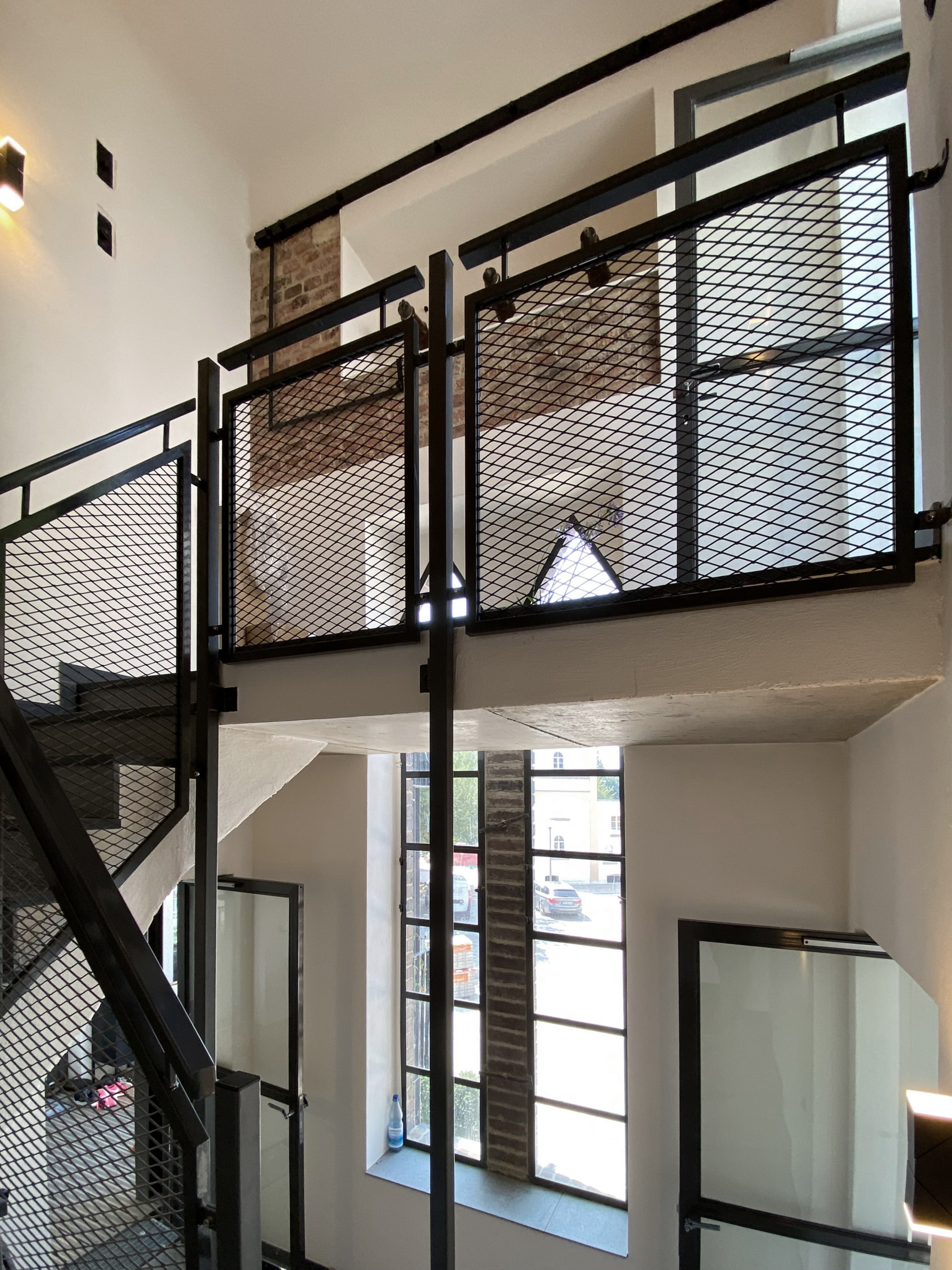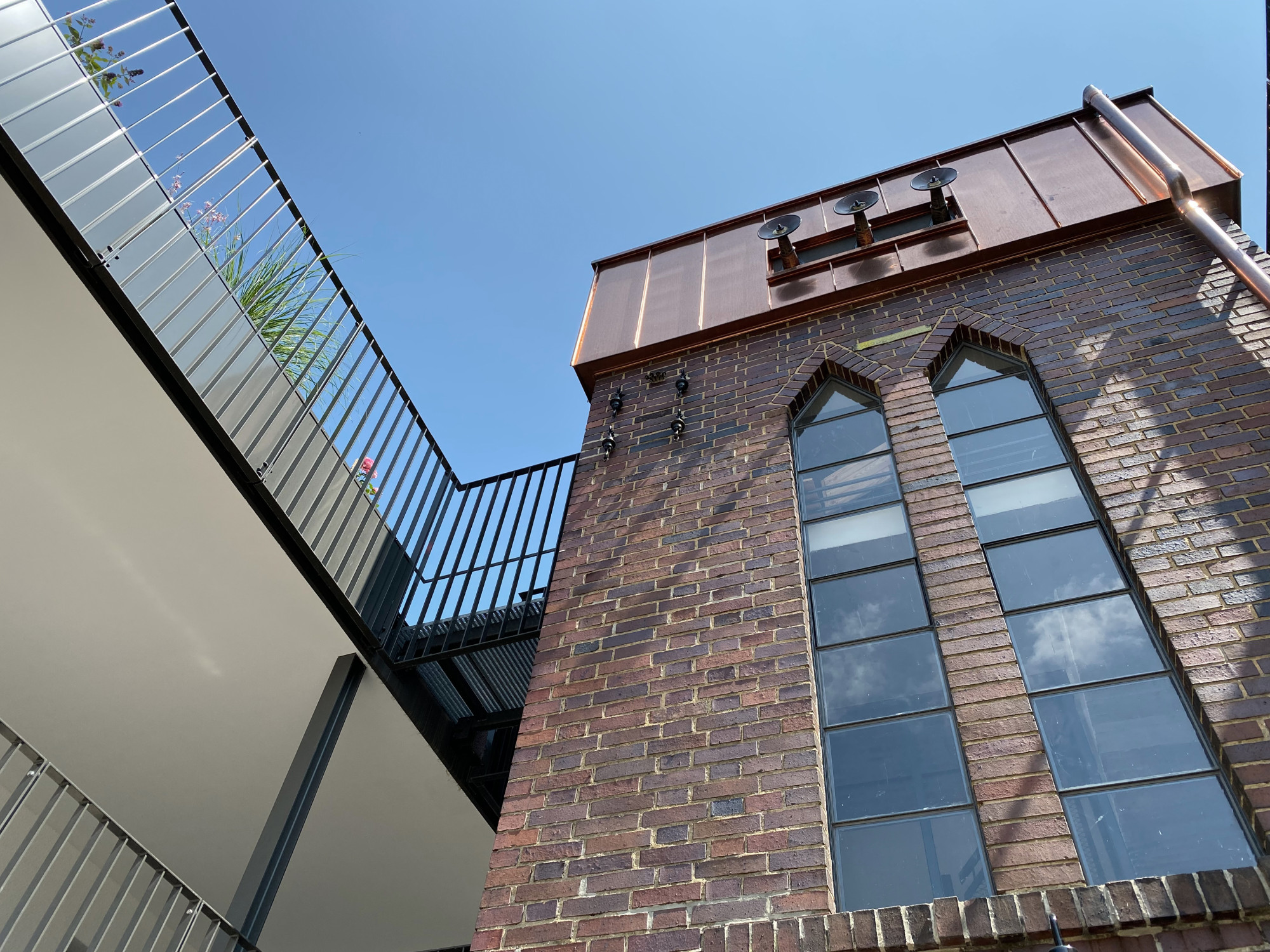 Außerdem planten wir zwei der Mehrfamilienhäuser im direkten Anschluss an den historischen Bestand. Besonderheit hierbei war die Integration des alten Lichthäuschens als Erschließungstreppenhaus. Zu unserem Leistungsbild gehörten u. a. die Bestandsanalyse der hallenartigen Industriearchitektur, die Konzeptentwicklung für Sanierung und Innenausbau unter Denkmalgesichtspunkten, die Koordination mit Denkmalbehörden und Fachplanern, die Ausführungsplanung, Bauleitung und Qualitätsüberwachung bei der Sanierung der historischen Fassaden, Fenster sowie Tragwerksmaßnahmen.