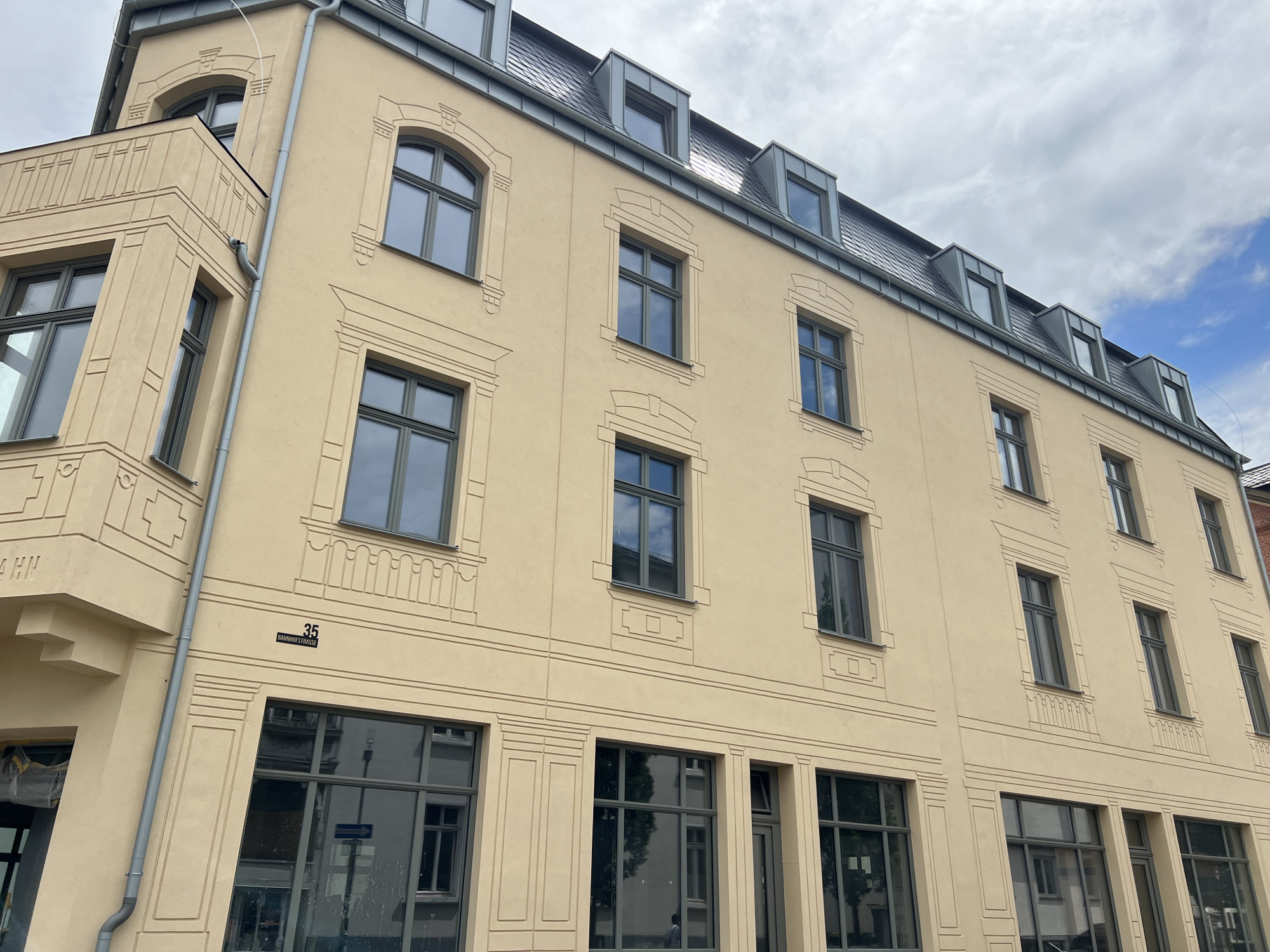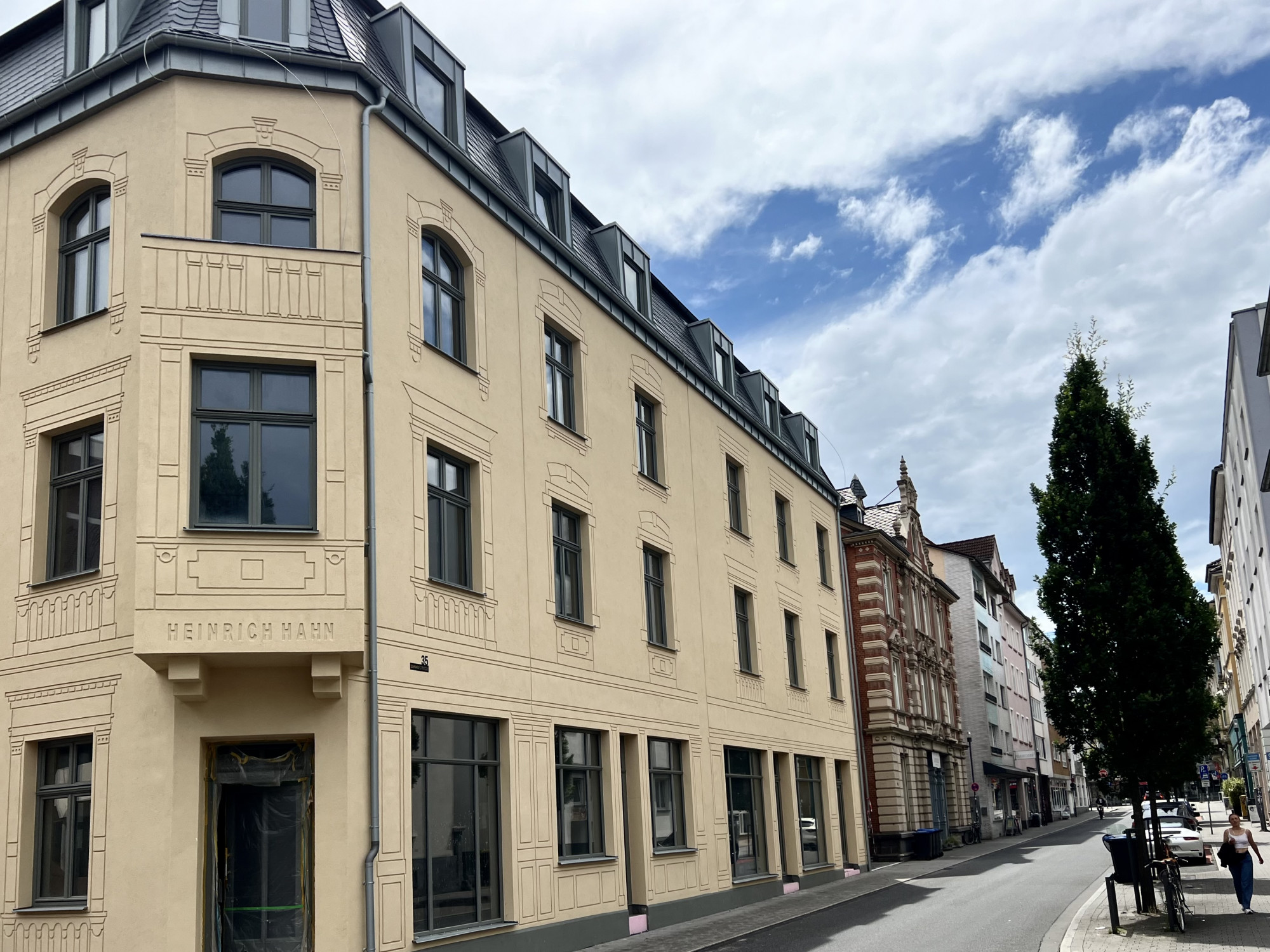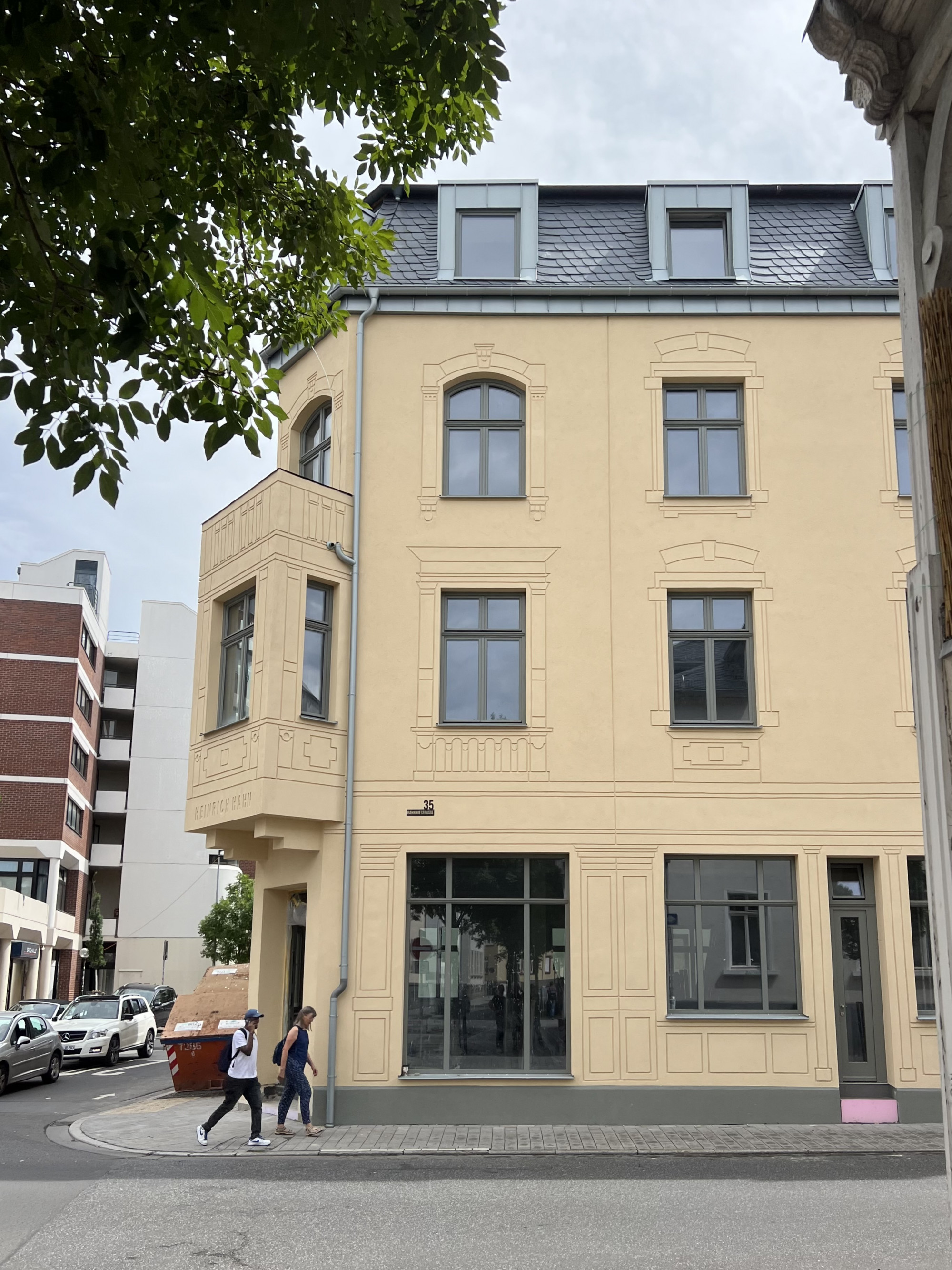Das Konzept verfolgt das Ziel, Geschichte, Gegenwart und Zukunft miteinander zu verbinden. Die Fassade des rekonstruierten Baukörpers interpretiert die Erscheinung des ursprünglichen Hauses auf zeitgenössische Weise neu: Mit einer handwerklich anspruchsvollen „Inverstechnik“ werden feine Rillen im Putz ausgeführt, die die historische Gliederung des früheren Gebäudes – inklusive Balkonbrüstungen, Gesimsen und des Schriftzuges „Heinrich Hahn“ – nachzeichnen. So entsteht ein subtiler Dialog zwischen Rekonstruktion und Neuinterpretation, der das Gedächtnis des Ortes sichtbar macht, ohne in bloße Kopie zu verfallen.