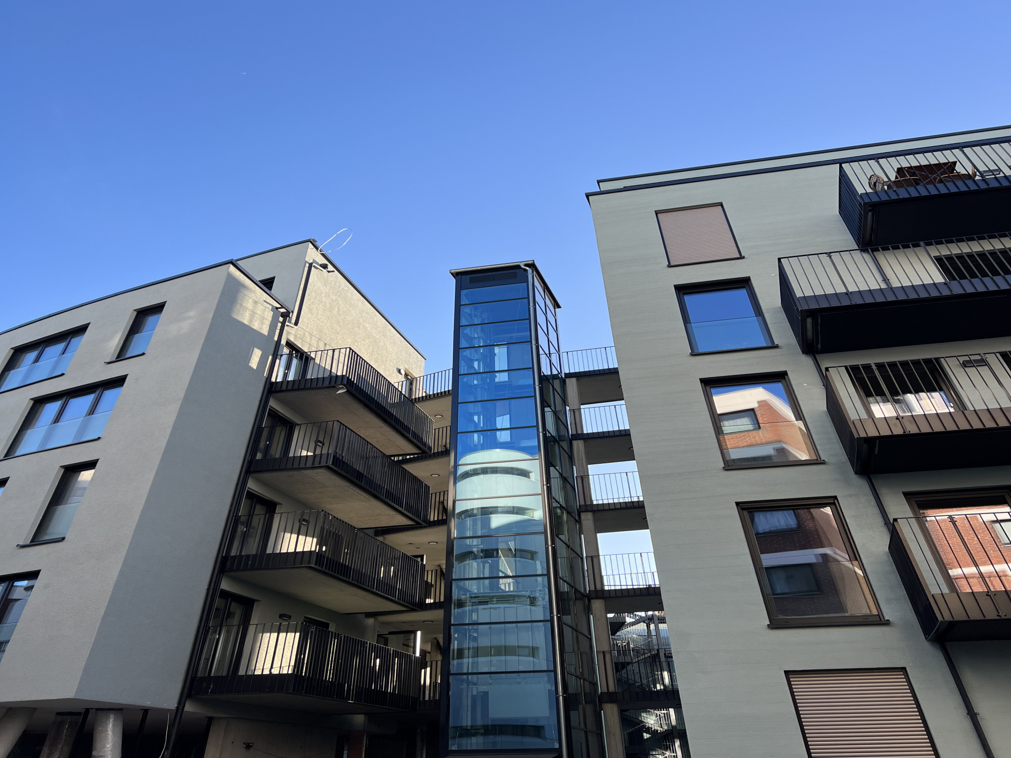 Gleichzeitig öffnet sich der Gebäudekomplex konsequent zur Stadt und zum Grün. Hochbeete entlang der Fassaden, begrünte Innenhöfe und großkronige Bäume in den offenen Treppenhäusern verleihen dem Ensemble seinen Namen und schaffen eine neue, lebendige Schnittstelle zwischen Architektur und Natur. Das Erdgeschoss ist auf Stützen angehoben, wodurch Durchblicke und Bezüge in die Höfe entstehen – ein Motiv, das Transparenz und Durchlässigkeit betont. Nachhaltige Elemente wie eine Photovoltaikanlage, Regenwassernutzung und ökologische Baustoffe ergänzen das Konzept einer zukunftsfähigen, urbanen Architektur.