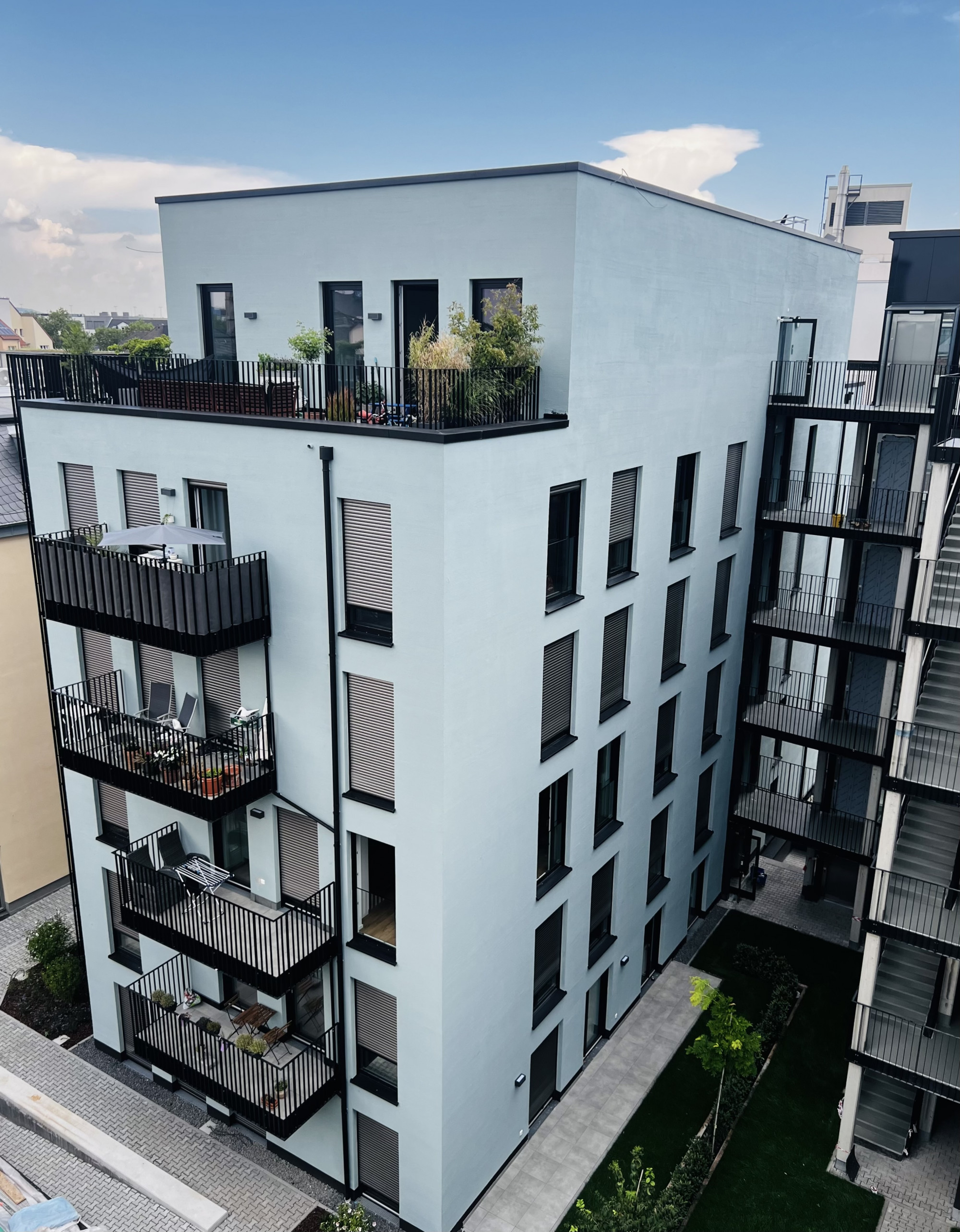 Der Stadtgarten umfasst vier Gebäudeteile mit insgesamt rund 70 bis 73 Wohneinheiten – von kompakten Einzimmerapartments bis zu großzügigen Penthousewohnungen mit über 120 m². Ergänzend entstehen etwa 1 000 m² Gewerbeflächen für Praxen, Büros oder Kanzleien.
