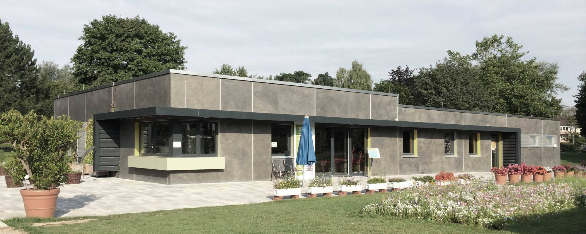 Die Betonoberfläche der Außenfassade wurde mit einer dunklen Lasur versehen, um sich gegenüber der parkartigen Umgebung zurück zu nehmen. Farbige Fensterleibungen in natürlichen gelb und grün Tönen aus der Umgebung komplettieren das Fassadenbild.