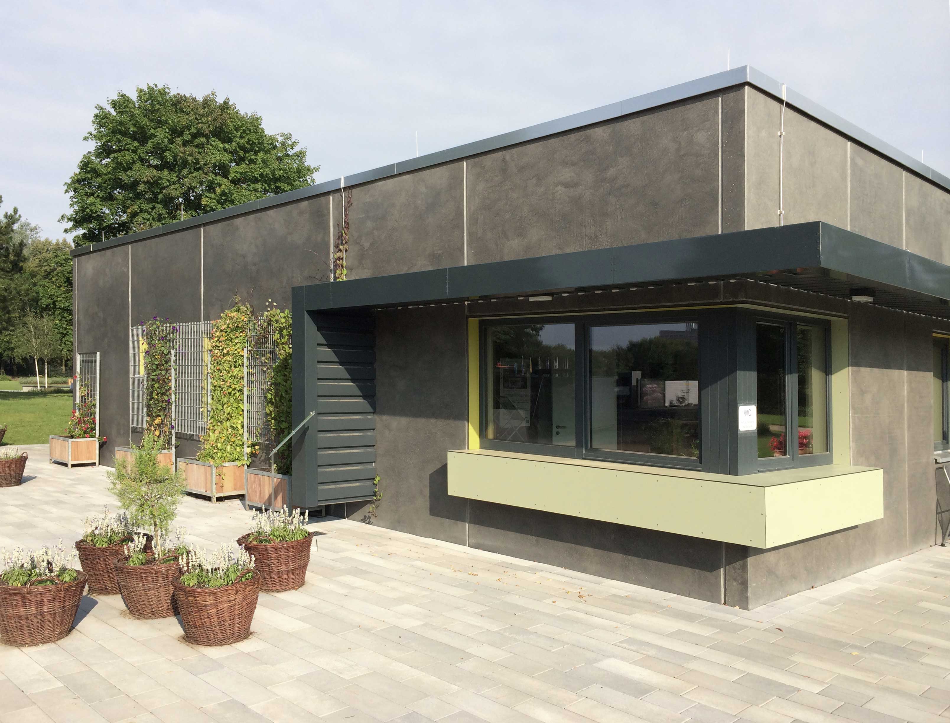 Der multifunktionale Baukörper wurde im Zuge der Landesgartenschau 2014 in Gießen entwickelt. Zu Zeiten der Ausstellung sollte er Raum für Büro-, Austellungs- und Lagerflächen bieten, allerdings so konzipiert sein, dass er in der Nachnutzung als Funktionsgebäude für das anliegende Sportgelände dienen und zwei Vereine beherbergen kann.