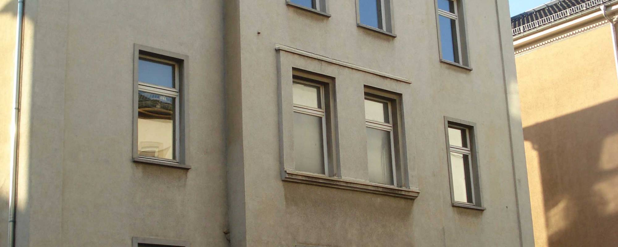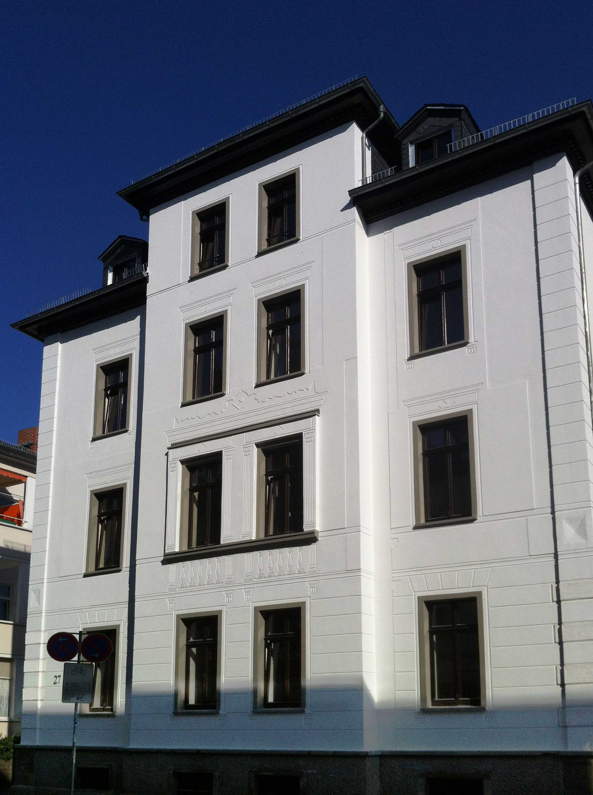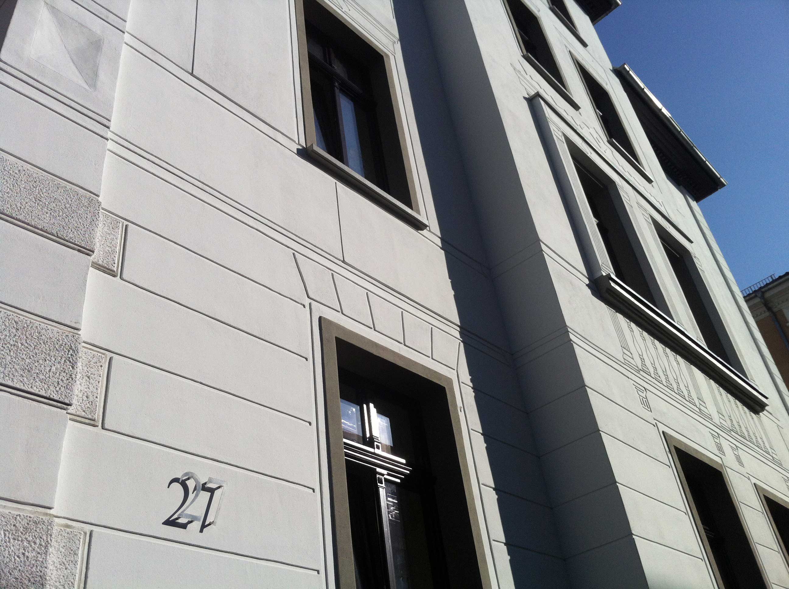 Das Wohnhaus von 1886 mit Mittelrisalit auf quadratischem Grundriss wurde in den 1960er Jahren mit der Entfernung aller Gliederungs- und Schmuckelemente nahezu gesichtslos. Anhand umfassender Archivrecherche, alter Planunterlagen und Postkarten wurden Informationen über das ursprüngliche Fassadenbild zusammengetragen. In einer Technik mit wassergestrahlten Schablonen wurden die Fassadenelemente inklusive den Schatten aus den Zeichnungen aufgebracht, überputzt und danach wieder entfernt, so dass sich ein Relief der ursprünglichen Fassade abzeichnet.
