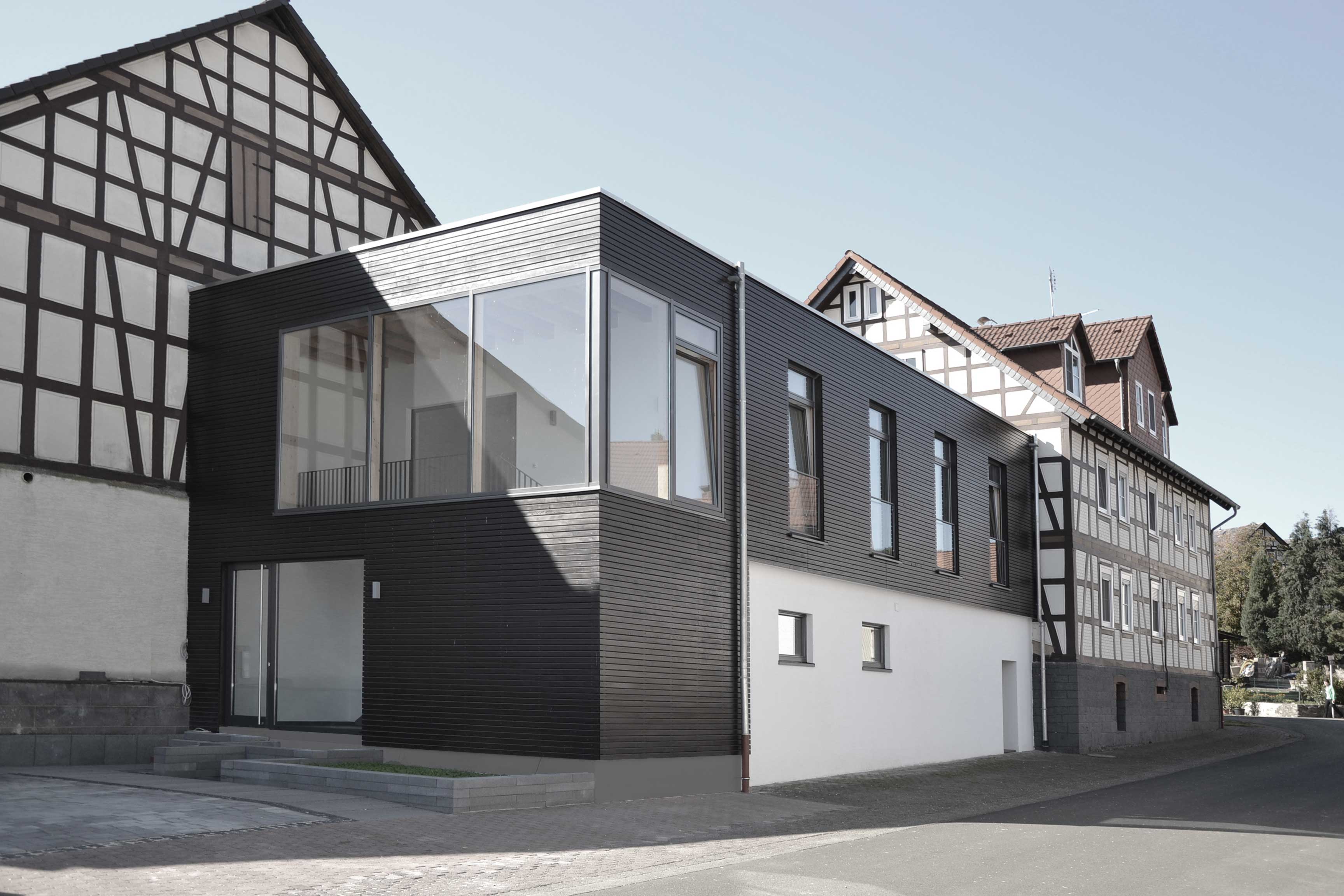 Die mitten im Ortskern von Romrod-Zell, in unmittelbarer Nähe zu Kirche und einem Ensemble aus Vogelsberger Einhäusern gelegene Hofreite erhält einen Erweiterungsbau. Die neu entstehenden Büroflächen legen sich als Flachdachbau über ein bestehendes Nebengebäude zwischen Wohnhaus und Scheune. Durch seine niedrigere Höhe, Dachform und die schlichten Formen, nimmt der Baukörper sich selbst zurück und fungiert mit seiner horizontal angeordneten Holzverschalung als Bindeglied der beiden Fachwerkbauten. Farblich nimmt die Holzfassade die dunklen Brauntöne der Fachwerkbalken wieder auf und schafft einen harmonischen Übergang.