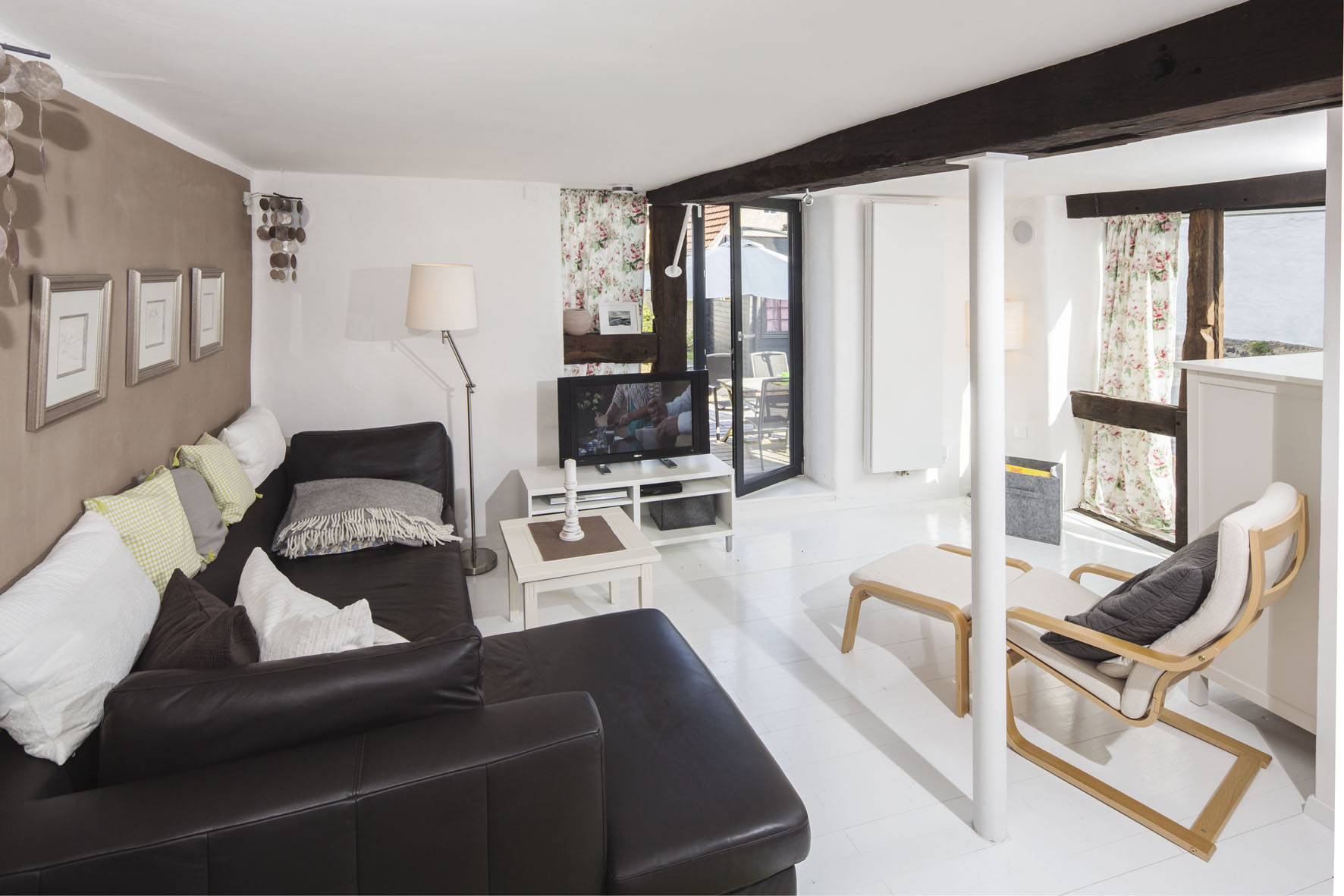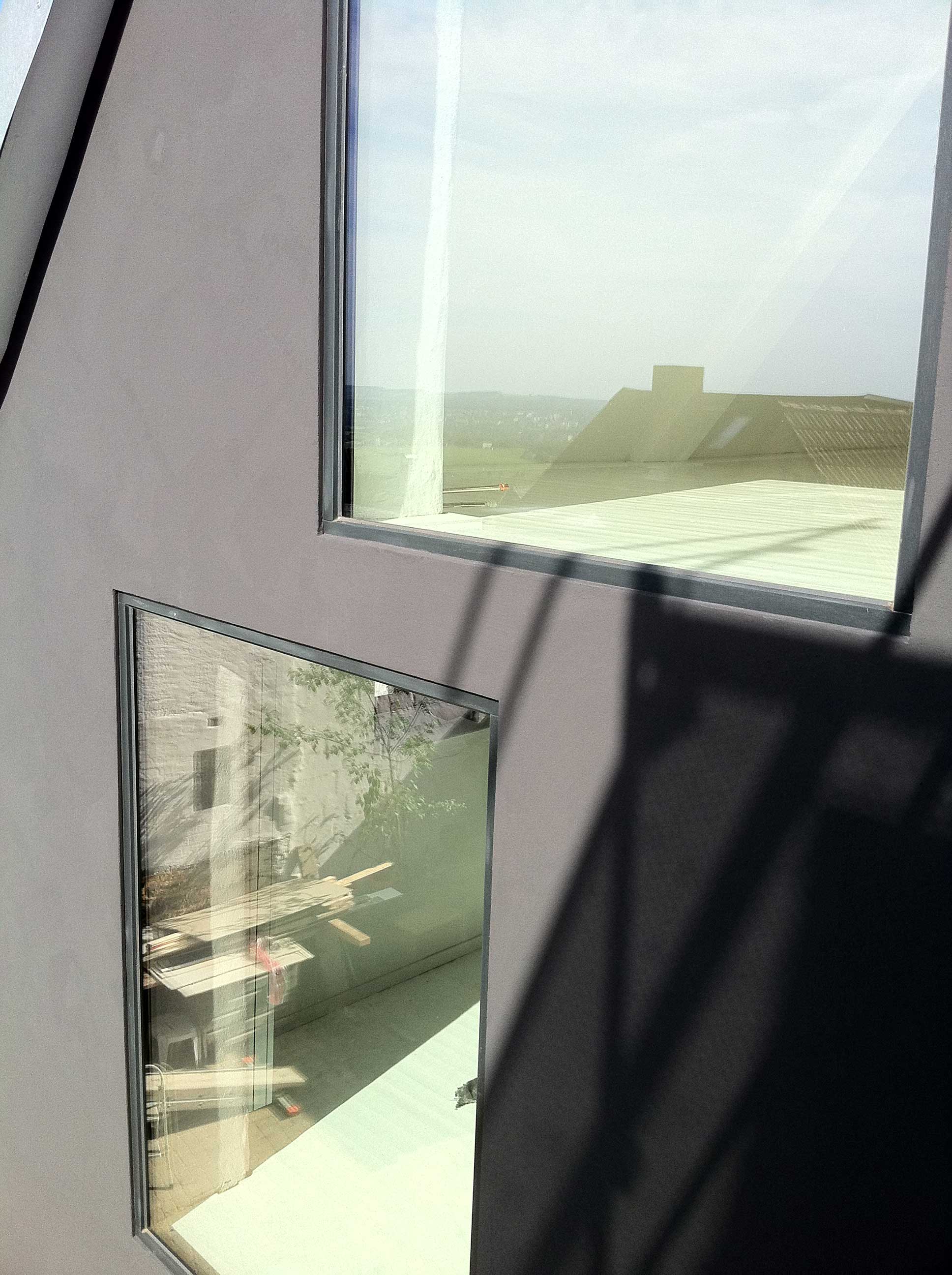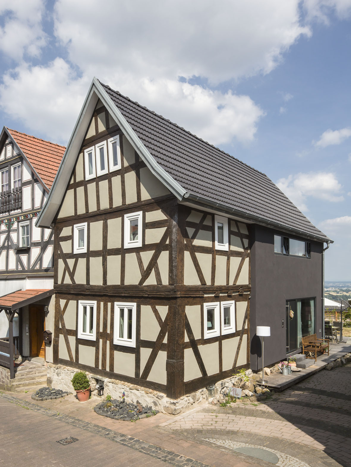 Im Zuge der "modernen" Fachwerksanierung eines historischen Wohnhauses bleibt die Kubatur des Gebäudes bestehen. Erhaltenswerte Elemente wie Fenster, einzelne Fachwerkbalken oder die Giebelseite zur Straße werden in ihren historischen Zustand zurückversetzt und gestalterisch hervorgehoben. Das Gebäude soll sich harmonisch in seine Umgebung einfügen, ohne auf moderne Standards zu verzichten. Der zur Straße orientierte Gebäudeteil bleibt daher fachwerksichtig. Die historische Fensterfront am Giebel wird wieder hergestellt. Am wesentlich schlechter erhaltenen rückwärtigen Gebäudeteil werden schadhafte Stellen der Konstruktion repariert und mit einer wärmedämmenden Vorsatzschale überzogen. Als Kontrast kommen hier moderne großformatige Fenster zum Einsatz. Diese liegen flächenbündig in der Dämmebene und lassen auf das dahinter liegenden Fachwerks blicken. Auf einen außen liegenden Sonnenschutz wird bewusst verzichtet, um den Charakter des alten Gebäudes zu erhalten. Der Ausbau vereint moderne Materialien mit dem Charakter eines historischen Gebäudes. So bleibt im Bereich der äußeren Vorsatzschale die Konstruktion von innen sichtbar und wird einem neuen Verwendungszweck zugeführt. Die vom Lehm befreite Holzkonstruktion soll als Bücherregal Verwendung finden und so als gestaltendes Element dienen. Im restlichen Bereich variieren weiß gekalkte Lehmputzflächen mit Sichtfachwerk.