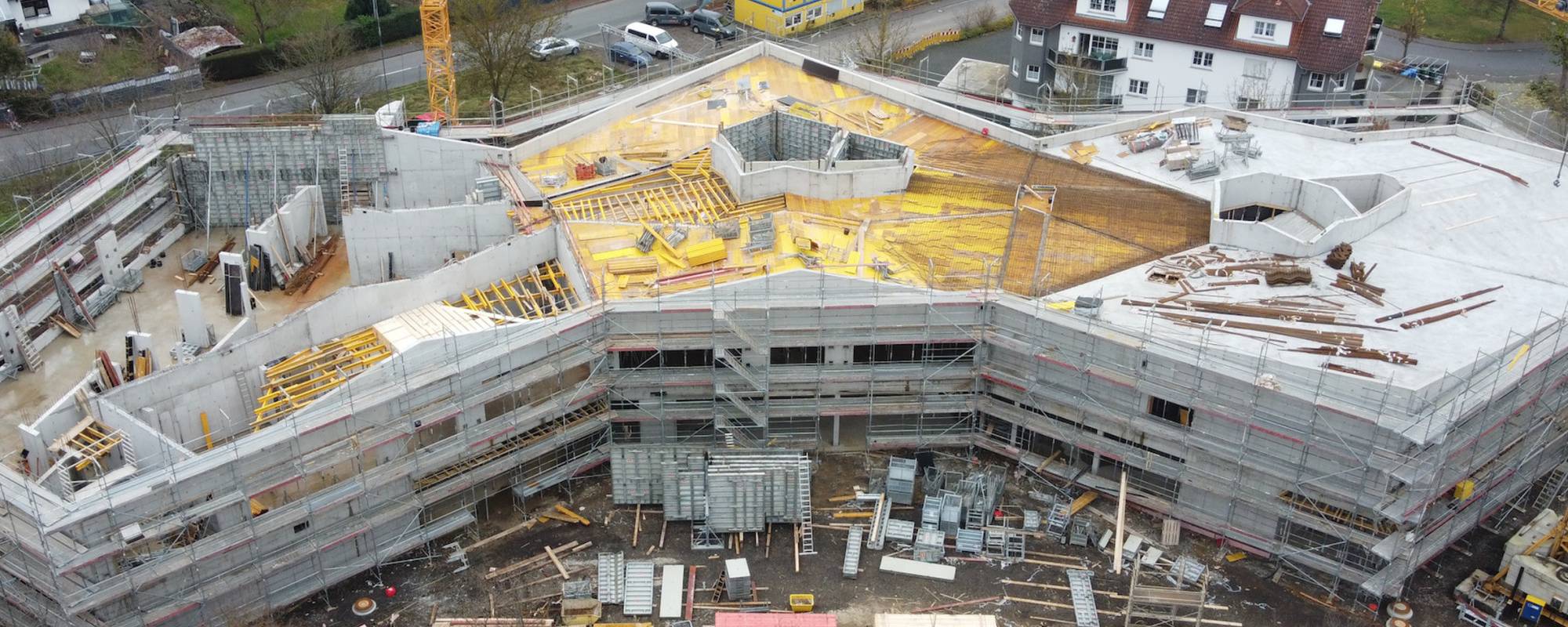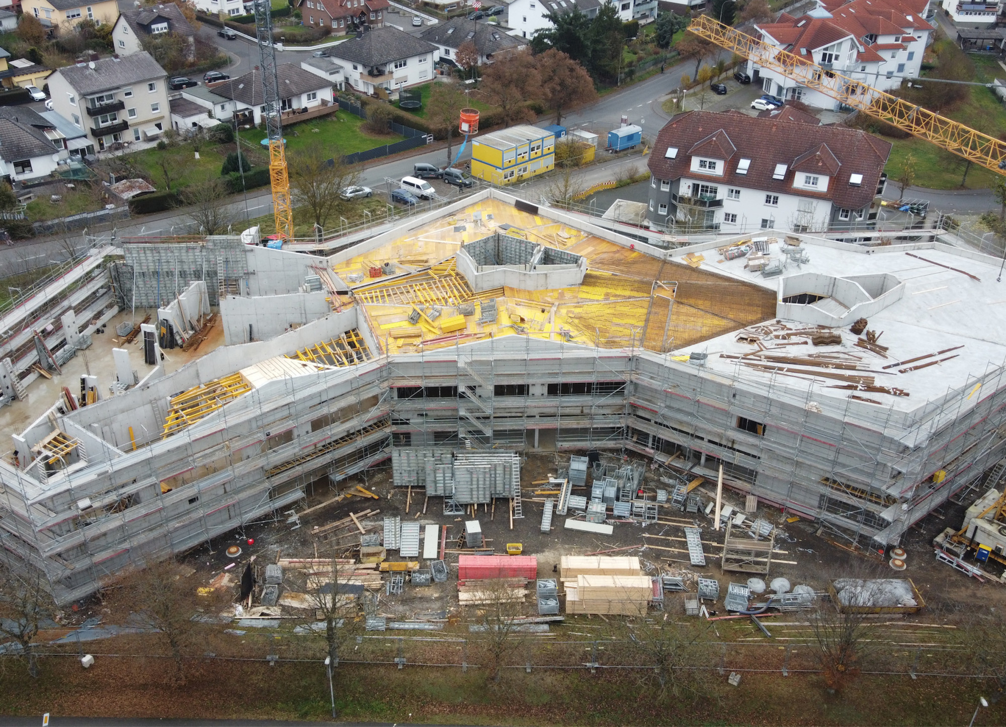 Betonbau fertiggestellt. Die Stahlbetonarbeiten für die Grundschule in Staufenberg sind fertiggestellt. Aus der Luft kann man nun gut die drei fünfeckigen Module des modernen Schulneubaus erkennen.